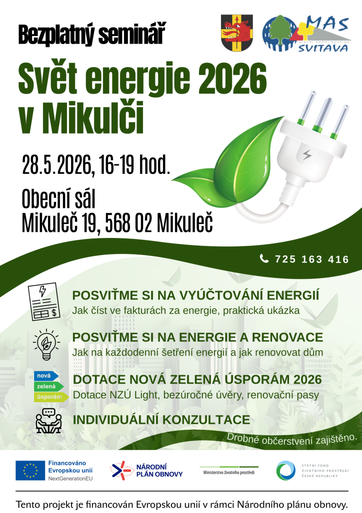 Ve spolupráci s obecním úřadem připravuje Místní akční skupina Svitava z. s. (MAS Svitava) bezplatný seminář zaměřený na energie. Akce se koná za podpory obce Mikuleč 28. května 2026 od 16.hod v Obecním sále Mikuleč 19.