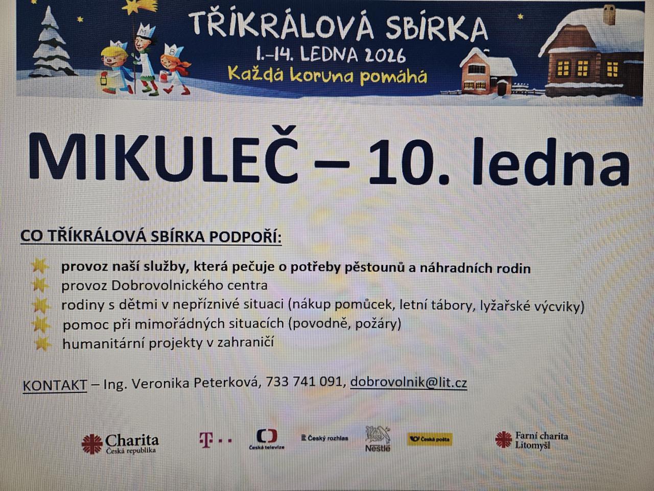 Tříkrálová sbírka, která se koná 10. ledna v Mikulči, má za cíl podpořit provoz služeb zaměřených na pomoc pěstounům a náhradním rodinám. Dále také podpoří Dobrovolnické centrum a rodiny s dětmi, které se nacházejí v nepříznivé situaci. Výtěžek sbírky přispěje na nákup pomůcek, letní tábory a lyžařské výcviky pro tyto rodiny, stejně jako na pomoc v mimořádných situacích, jako jsou povodně nebo požáry.